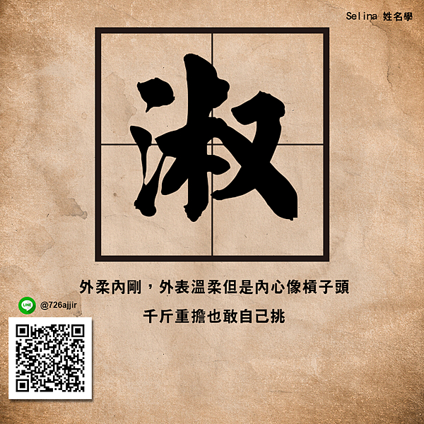 很多女生名字中間有「淑」的,都是外柔內剛,外表溫柔但是內心像槓子頭,千斤重擔也敢自己挑。她覺得別人都不懂她的心,很多事情放在心裡不愛講不愛說,但是內心了了分明。