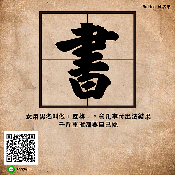中國古代的文化傳統,就是「萬般皆下品,唯有讀書高」。所以在歷朝歷代的文化典籍當中,留下了很多的惜時苦讀勸學的詩篇。因此很多女名會用到「書」。但是女用男名叫做「反格」,會凡事付出沒結果,千斤重擔都要自己挑,女強人背後的辛酸只有自己知道。再辛苦也要強忍叫做心事無人知!