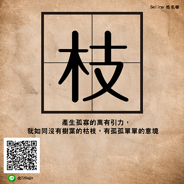 名字會產生萬有引力的關係,叫甚麼名字,就如同穿甚麼戲服,演出什麼樣的人生!名字用到「枝」,感情會像枯枝般的孤單,孤獨,會傷福德,產生如同殘枝敗葉般的意境!