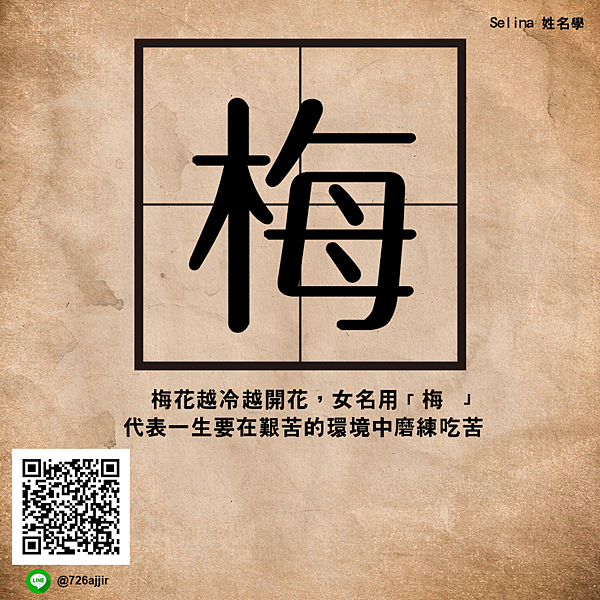 梅花越冷越開花,女名用「梅 」代表一生要在艱苦的環境中磨練吃苦,才能綻放自己的光芒。梅花帶有冷傲、孤獨、淒涼之意,女名用「梅」容易六親無靠,感情不順,婚姻難成,晚年孤寂,子女緣薄,有福祿難全的現象。