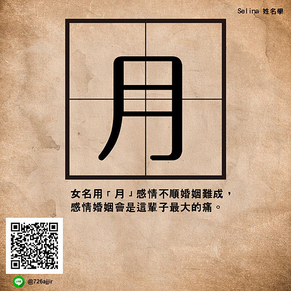 女名喜用「月」取其月貌花容,容貌姣美之義。但是月亮孤孤單單掛在天空上,嫦娥奔月,獨守廣寒宮。「月」字帶有孤獨的含意。女名用「月」感情不順婚姻難成,感情婚姻會是這輩子最大的痛。~「月」字代表孤寂任何女生都不準用!