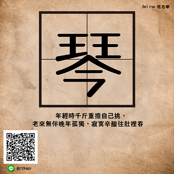 琴的陰邊「今」字代表「令不成令」,凡事沒結果,任何人不準使用。「琴」在名1會操心勞心煩心,先生就是不懂妳的心,ㄧ輩子犯小人。「琴」在名2損福德,錢財左手接右手空,工作辛苦有份,享福卻沒妳的份!凡事操煩勞碌,沒做會死要做到死。