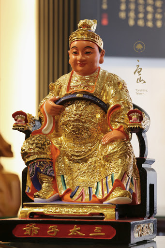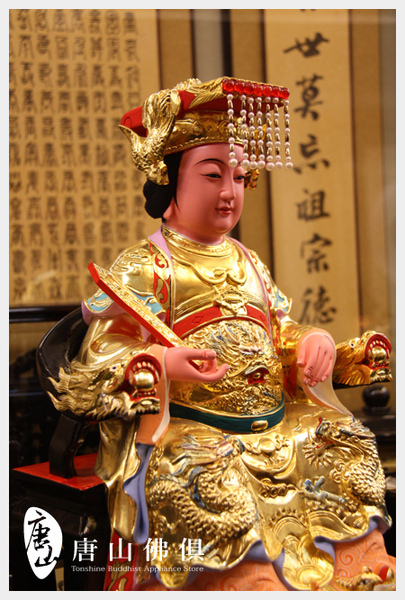 ❶供奉在尊位,法像頭戴鳳冠、雙手持「奏板」置於胸前,端坐在龍椅當中,呈執事的姿態。