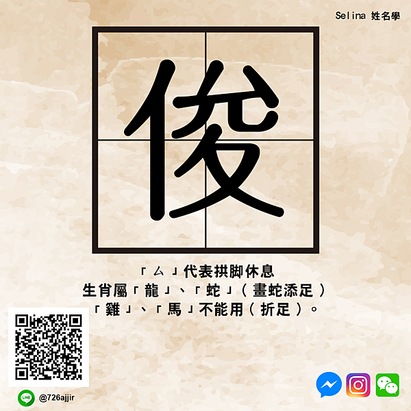 「俊」的「厶」代表拱腳休息,生肖屬「龍」、「蛇」(意畫蛇添足,多此一舉);「雞」、「馬」不能用(代表折足)。