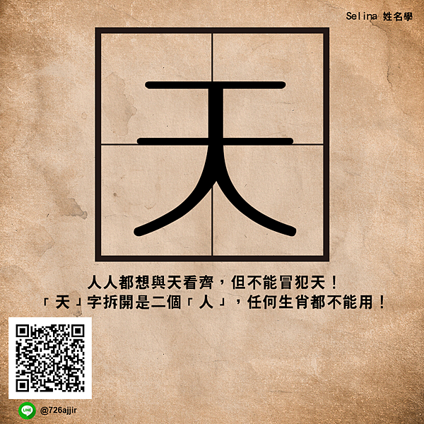 #男人命名禁忌~天! 天最大,人的頭頂上有一片天。人人都想與天看齊,但不能冒犯天!「天」字拆開是二個「人」,任何生肖都不能用!